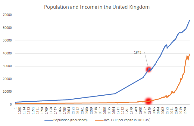 Writer and economist Jerry Bowyer has argued in Forbes that with A Christmas Carol, Dickens was weighing in on a central economic debate of his time. That is, the debate between Malthusians and the disciples of the Scottish economist Adam Smith, like the French economist Jean Baptiste Say, who argued that peaceful market exchange could create prosperity and meet the needs of a growing populace. Say was right. As the chart above shows, British population growth coincided with massive enrichment.